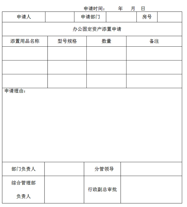 第八条  各部门人员提出添置办公固定资产用品,需填写《办公固定资产用品申请表》(见附件1),经部门负责人签署意见提交综合管理部审核。采购金额1万元(含)以下的经行政副总审批同意后购置;采购金额1万元以上的经行政副总、总经理联审批准后购置,由综合管理部统一采购。常用固定资产使用年限到期且不可使用方可重新申请购置(见附件2:常用固定资产使用年限表)。